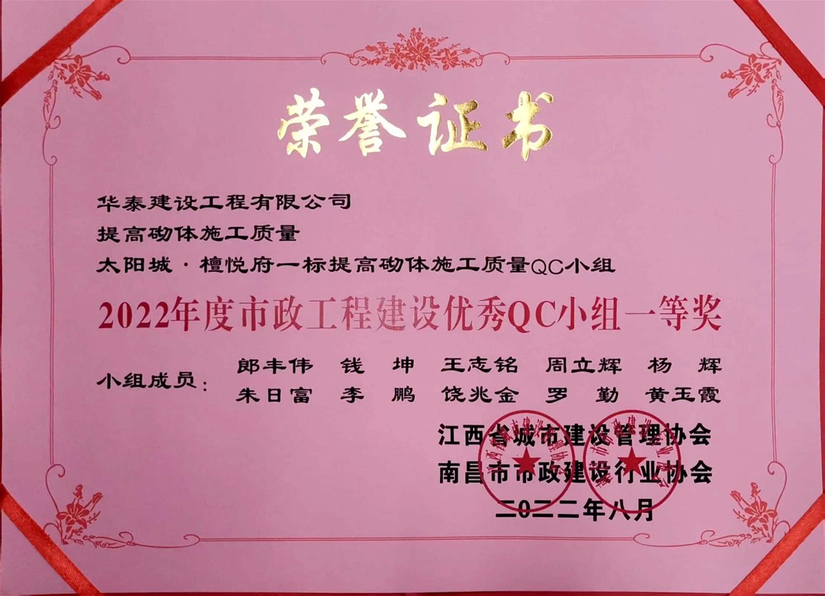 金秋九月,華泰建設(shè)太陽城·檀悅府一標(biāo)QC小組榮獲2022年度江西省市政工程建設(shè)優(yōu)秀質(zhì)量管理小組活動(dòng)一等獎(jiǎng),南水中央QC小組及“華創(chuàng)”QC小組榮獲二等獎(jiǎng)。